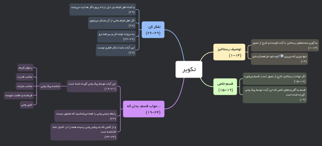سوره مبارکه تکویر، با هدف اصلی اثبات حتمیت و هولناکی قیامت، از طریق ترسیم هشت نشانه آغازین فروپاشی کیهان (از درهم پیچیده شدن خورشید تا برافروخته شدن دریاها) و مراحل نهایی حسابرسی، یک تصویر واضح و هشداردهنده از پایان دنیا ارائه میدهد.