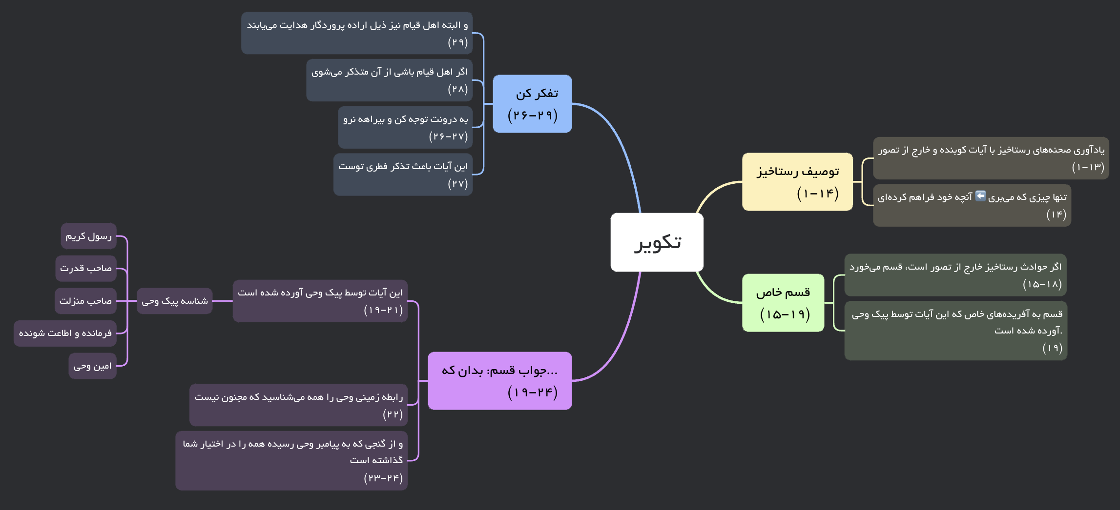 - اِذَا الشَّمْسُ كُوِّرَتْ: موقعی که خورشید در هم پیچیده میشود و جمع میشود. نور خورشیدی که میلیونها سال نورافشانی کرده است، ناگهان در خود پیچیده شده، جمع و خاموش و تاریک میشود.